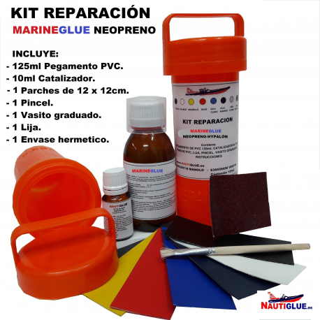 EL KIT DE REPARACION  MARINEGLUE de  NEOPRENO / HYPALON de 2 componentes, incluye ( 1 botellín de PEGAMENTO de 125ml +1 botellín de catalizador de 10ml+ 1 parche de 10 x10cm +1pincel +trozo de lija + vasito graduado y un envase hermético).